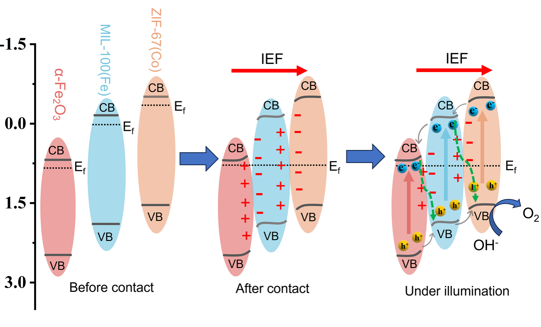 赤铁矿(α-Fe2O3)薄膜因其化学组成可调、能带可控等特点在光电化学分解水(PEC-WS)领域优势凸显,然而表面较低的OER反应速率阻碍了其进一步应用;而MOFs催化剂通过其高比表面积和可调节的纳米结构吸引了广泛关注,将两者的优点结合在PEC-WS领域发挥更大的作用还有待探索。因此我校光电化学转换团队设计了一种新型的MOF-on-MOF (MIL-100-on-ZIF-67)异质结催化剂,并通过原位生长将其负载到α-Fe2O3用于PEC-WS,促使光电化学转换性能提升150%。通过UPS,同步辐射和飞秒瞬态吸收测试,并结合DFT理论计算揭示了复合材料的光生电子与空穴的转移机制。